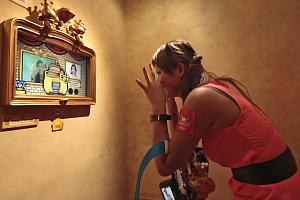 Una chica juega un videojuego de Hello Kitty a la entrada del parque temático de este emblemático personaje en Hong Kong, China. El parque temático prepara el 36 anversario del polpular personaje y una de las mayores atracciones serán los videojuegos y dispositivos electrónicos donde aparece la famosa gatita.